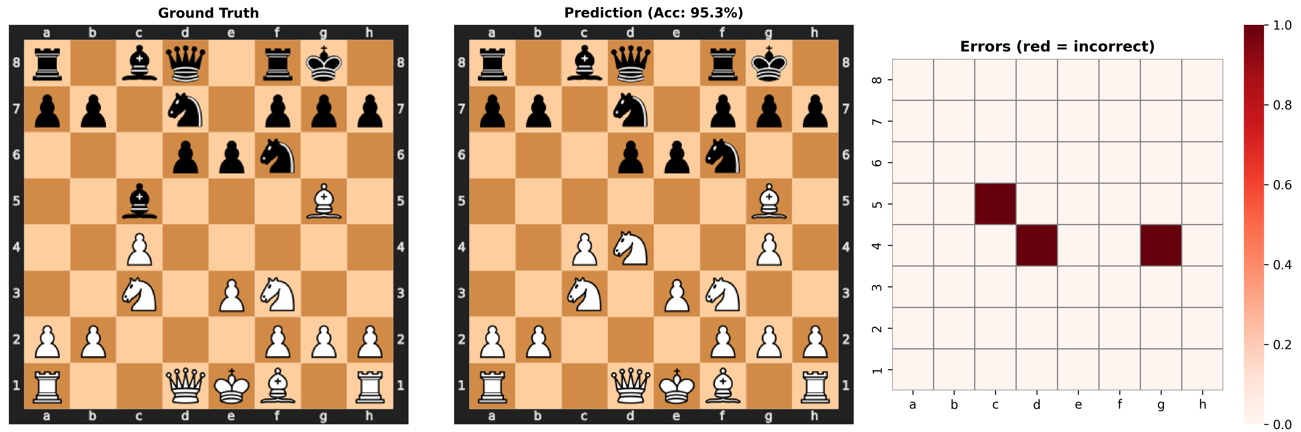 Looking at some random positions, we can see that most of the time it does a perfect job reconstructing the position. Occasionally, it will make small errors, some of which are nonsensical like three knights. Sometimes, however, it fails a lot of the pieces, even though it still gets a decent accuracy. It seems in these catastrophic failures, it fails in nearly every way: it misses some pieces, it moves some pieces, and it replaces a bunch of pieces with pawns, including white pawns on the eight rank and the first rank! This suggests that in these cases it is not just one probe or one small part of the representation that is insufficient, but a large part of the representation that contains the information about many locations and pieces.