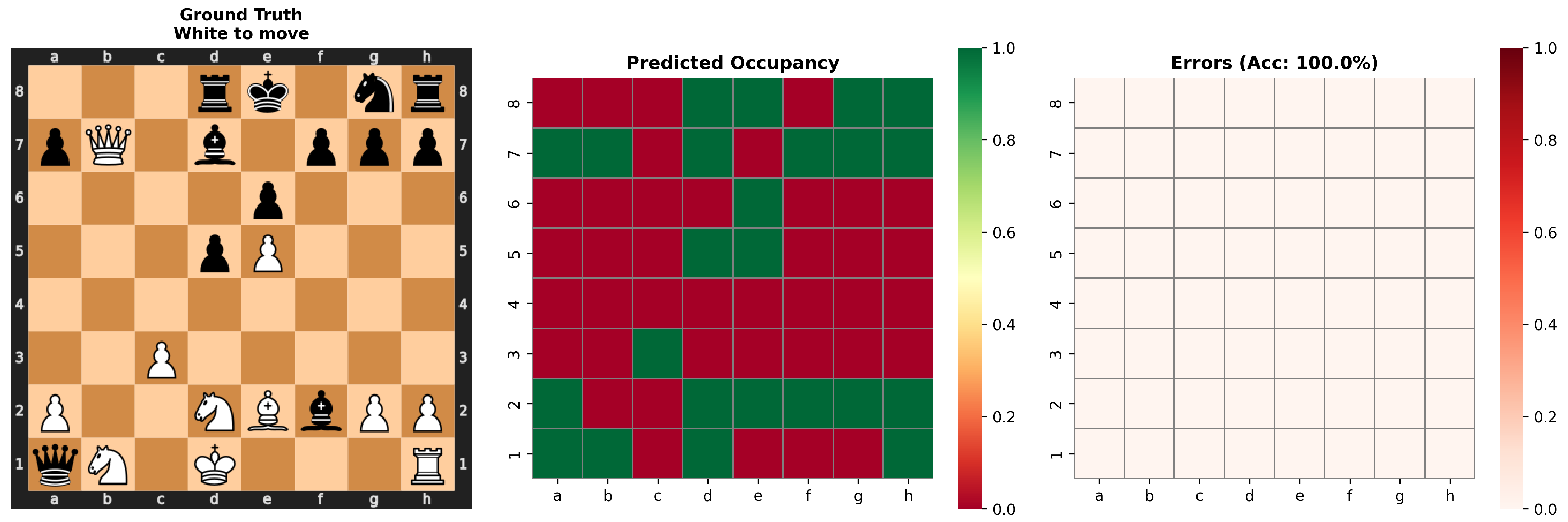 - Square Occupancy. For each of the 64 squares, I train a separate probe that predicts if that square is occupied. This is a simplified board state probe.