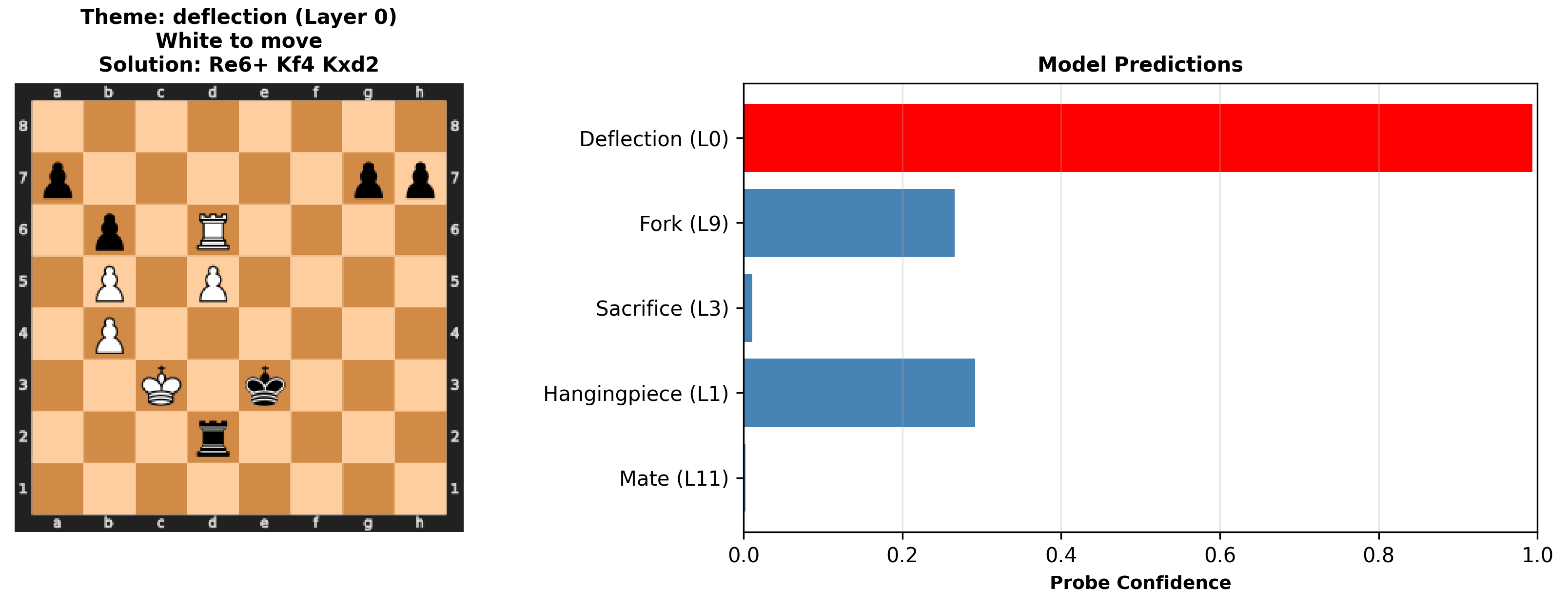 Looking at some examples, we see the model does very well on obvious puzzles, and is even able to discern some more complicated tactics. Note that some puzzles have multiple themes, and while I only display one theme in the title, these themes are correctly used when training and evaluating. However, when a theme is not present we still see some probes detecting tactics. Moreover, the model just completely fails to detect the theme in some puzzles. This seems especially to be the case with longer puzzles, and it may be worth trying to limit the dataset to only a few moves, or even training a different probe for different look ahead distances. Still, I would hope to see the feature for a given tactic present in advance of the given state that has that tactic, as this would show the model has some understanding of not just the game now, but where the game is heading and what moves will be available then.